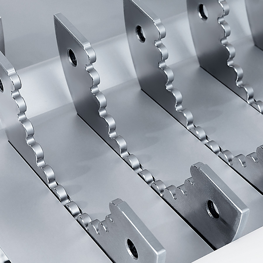 В тележку для ножей помещаются до 16 куттерных ножей. Лезвия ножей защищены от повреждений с помощью пластмассовой планки. Все компоненты, необходимые для установки и крепления системы куттерных ножей, удобно расположены на тележке для ножей.